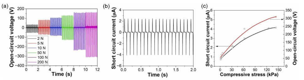 圖 6. 力幅對開路電壓和短路電流輸出的影響:(a)2、5、10、50、100 和 200 N 下的電壓輸出;(b)200 N 下的短路電流;(c)電壓和電流輸出與壓力的關(guān)系。