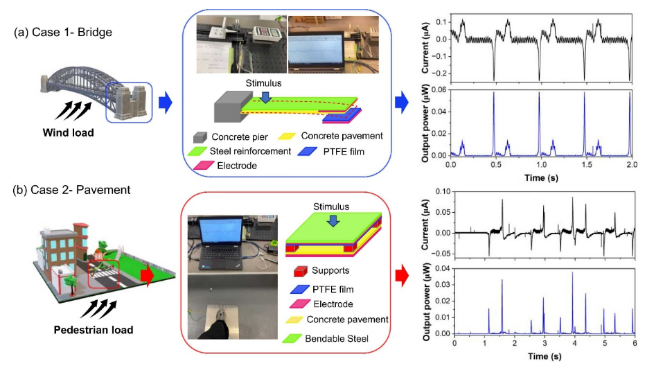 圖 10. 為土木工程應(yīng)用而設(shè)計(jì)的水泥基 TENG:案例 1(用于風(fēng)能收集的橋梁應(yīng)用)和案例 2(用于行人和車輛誘導(dǎo)的機(jī)械能收集的路面應(yīng)用)的原理圖、實(shí)驗(yàn)裝置和輸出電流和功率。