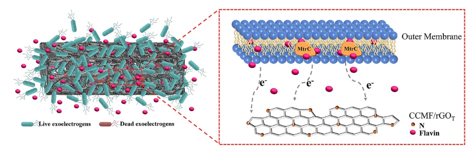 微生物燃料電池(MFC)利用微生物作為催化劑將化學(xué)能轉(zhuǎn)化為電能。然而,目前MFC的實際應(yīng)用受到功率輸出低的阻礙,這是由于陽極上微生物定植不足、微生物-陽極界面處細(xì)胞外電子轉(zhuǎn)移緩慢以及陰極處氧還原反應(yīng)催化效率低造成的。在此,通過熱解三聚氰胺甲醛樹脂(MF)、殼聚糖(CTS)和氧化石墨烯(GO)的交聯(lián)復(fù)合材料,碳化-CTS-MF/rGOtempreture(CCMF/rGOT)的三維(3D)分級多孔陽極。大孔陽極為產(chǎn)電原和3D電子轉(zhuǎn)移途徑提供了生物相容性表面。此外,石墨-N和吡咯-N含量的適當(dāng)平衡優(yōu)化了電導(dǎo)率和活性位點數(shù)量,從而協(xié)同增強(qiáng)了細(xì)胞外電子轉(zhuǎn)移(EET)效率。因此,CCMF/rGO1000陽極的功率密度為11.28 W/m3,超過了沒有3D還原氧化石墨烯(rGO)導(dǎo)電網(wǎng)絡(luò)的CCMF1000陽極(10.04 W/m3)和傳統(tǒng)碳布陽極(4.36 W/m3)。此外,陽極在0.69 V的最大工作電壓下穩(wěn)定運行超過200天,化學(xué)需氧量(COD)去除率達(dá)到95.4%。這項工作為制備富集放電源和增強(qiáng)EET的獨立3D陽極以改善MFC性能提供了一種有前途的策略。