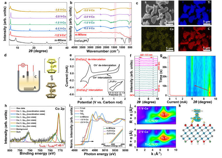 + 的插層過程和氧化還原轉(zhuǎn)化機(jī)制示意圖。(e) 雙電極器件的循環(huán)伏安法 (CV) 曲線,其中 m-MXene 顆粒作為工作電極,石墨棒作為對(duì)電極。使用的二茂鐵/二茂鐵偽參比顯示在面板 (e) 的底部插圖中。(f) 原位電化學(xué) XRD 圖譜和 (g) 常數(shù) −1 V 偏置下插層過程的等值線圖。(h) 通過施加 -1 V 的偏壓對(duì)插層產(chǎn)物的 Co 2p 截面的 X 射線光電子能譜 (XPS) 光譜。(i) 從 -1 到 -2 V 得出的原始 m-MXene 和茂金屬插層