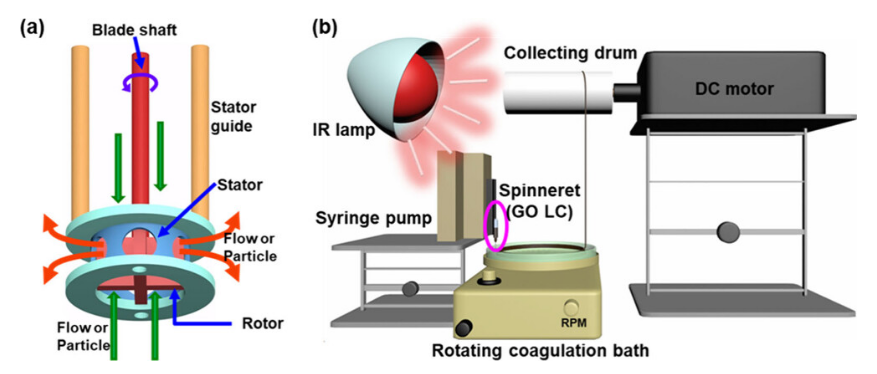 圖1. 高剪切混頻器制備氧化石墨烯纖維示意圖。(a)高剪切混合器,由定子和轉(zhuǎn)子之間有小間隙組成。(b)濕紡絲裝置,由帶噴絲器的注射泵、旋轉(zhuǎn)冷凝、紅外燈和旋轉(zhuǎn)收集鼓組成。