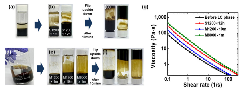 圖3. 使用GO LC涂料。(a–f)通過(guò)(a–c)磁攪拌和(d–f)高剪切混合獲得的GO LC涂料的數(shù)字照片。將瓶子倒置,檢查每種情況下的粘度狀態(tài)。(g) 粘度是每個(gè)樣品剪切速率的函數(shù)。