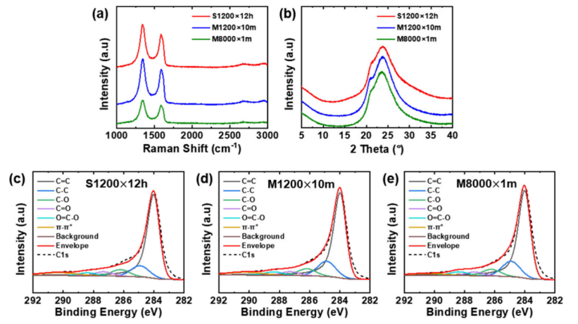 (c - e)使用(C) S1200 × 12h, (d) M1200 × 10m, (e) M8000 × 1m的氧化石墨烯LC摻雜制備的光纖的XPS C1s光譜。