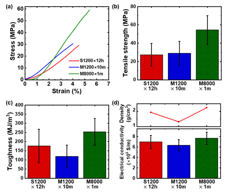圖6. 通過(guò)磁攪拌和高剪切混合制備的GO-LC摻雜rGO纖維的力學(xué)和電學(xué)性能:(a)代表應(yīng)力-應(yīng)變曲線,(b)拉伸強(qiáng)度,(c)韌性,以及(d)密度和電導(dǎo)率。