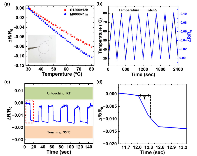 圖7. 使用rGO纖維的柔性纖維形熱敏電阻。(a) S1200×12h和M8000×1m光纖的相對(duì)電阻隨溫度的變化。插圖顯示了纖維熱敏電阻的靈活性。(b) 采用M8000×1m制作的rGO光纖熱敏電阻的循環(huán)電阻響應(yīng)。(c) 在35°c與熱源周期性接觸期間熱敏電阻的相對(duì)電阻變化。(d) 根據(jù)(c)中的電阻響應(yīng)估算的時(shí)間常數(shù)。