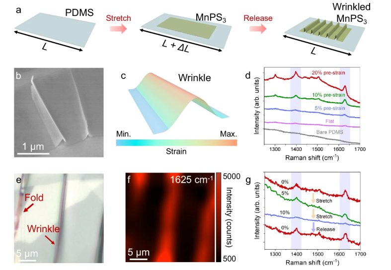 圖1. 從(a)傳統(tǒng)的無等離子體SERS基底到(b)起皺和(c)化學(xué)功能化相結(jié)合的機(jī)械化學(xué)SERS平臺(tái)的演變過程示意圖演示。d二維MnPS