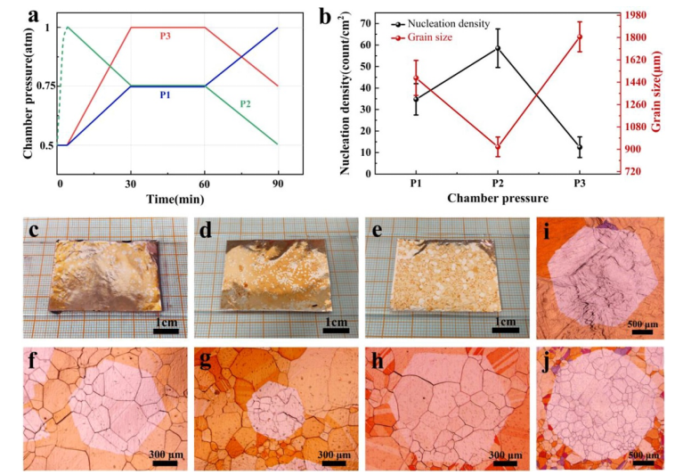 3三種壓力調(diào)節(jié)下在Cu上生長石墨烯的數(shù)字圖像。(f-h)與面板(c) - (e)對應(yīng)的生長石墨烯的OM圖像。(i, j) P