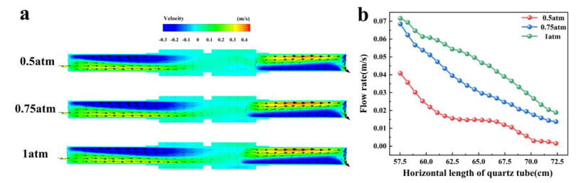 圖5. (a)三腔室壓力條件下流場分布輪廓。(b)石墨烯反應(yīng)位置流速分布圖。