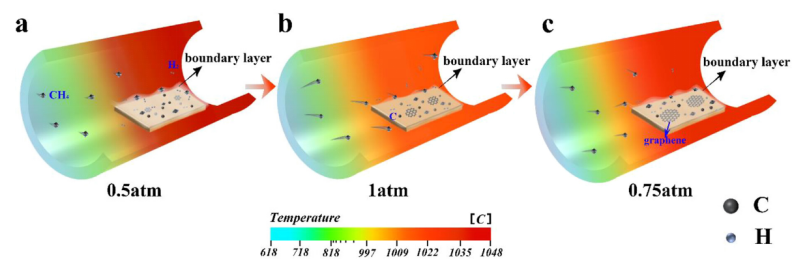 圖6. 在Cu襯底上動態(tài)調(diào)節(jié)環(huán)境壓力制備的石墨烯示意圖:(a) 0.5, (b) 1, (c) 0.75 atm。