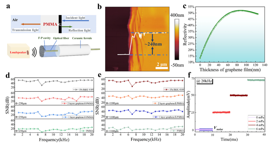 圖7. (a) DFPI光纖傳感器原理圖及光傳播方向示意圖。(b) PMMA層AFM圖像。(c)不同厚度的石墨烯膜與PMMA -石墨烯復合膜反射率的關(guān)系。(d, e)不同參數(shù)下DFPI傳感器頻域信號對比。(f) 2層單晶石墨烯- 240 nm PMMA復合薄膜傳感器在20 kHz低聲壓下的輸出信號。