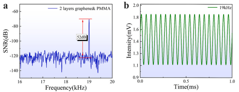 圖8. (a) 2層石墨烯- pmma復合薄膜傳感器在19khz時的頻域信號和(b)時域頻譜。