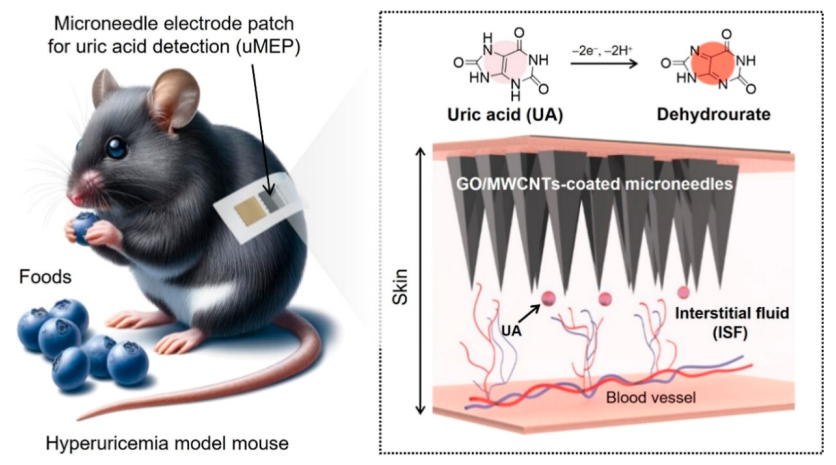 高尿酸血癥是一種常見的嘌呤代謝異常引起的疾病,可進(jìn)一步引起慢性腎臟疾病、心血管疾病和痛風(fēng)。其主要病理特征是血中尿酸(UA)水平高,因此UA的檢測對高尿酸血癥的診斷和治療具有重要意義。在此,報道了一種生物相容性和微創(chuàng)微針電極貼片(MEP)用于持續(xù)UA監(jiān)測和高尿酸血癥患者的飲食管理。將氧化石墨烯與羧化多壁碳納米管復(fù)合材料修飾在微針電極表面,增強(qiáng)其靈敏度、選擇性和穩(wěn)定性,從而實(shí)現(xiàn)對間質(zhì)液中UA的連續(xù)檢測,準(zhǔn)確預(yù)測血液中UA水平。這使進(jìn)一步研究花青素對高尿酸血癥模型小鼠的降尿酸作用。研究發(fā)現(xiàn),從藍(lán)莓中提取花青素可以有效抑制黃嘌呤氧化酶的活性,從而降低UA的產(chǎn)生。飼喂花青素的高尿酸血癥模型小鼠的UA水平比對照組低約1.7倍。本研究相信這種MEP為高尿酸血癥患者的持續(xù)UA監(jiān)測和飲食管理提供了巨大的希望。