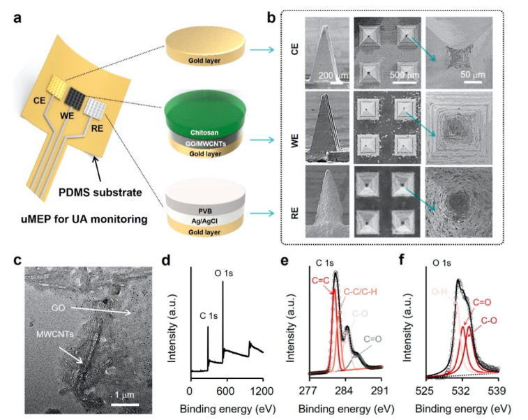 圖2(a) uMEP結(jié)構(gòu)示意圖。(b)單個微針在CE、WE和RE中的側(cè)視掃描電鏡(SEM)圖像(左)。對應(yīng)的SEM俯視圖(中)和單個微針尖端的放大圖像(右)。(c)氧化石墨烯/MWCNTs的透射電鏡(TEM)圖像。(d - f) GO/MWCNTs的c1s (e)和o1s (f)的全x射線光電子能譜(d)和XPS能譜。