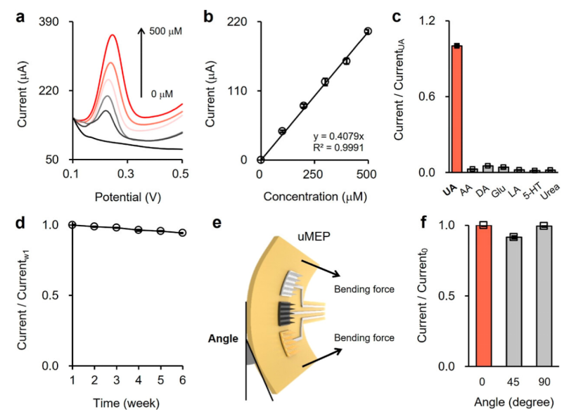 UA和current是指uMEP在含有400 μM UA和其他物質(zhì)的模擬皮膚瓊脂糖凝膠中得到的氧化電位電流。(d)在室溫下保存1-6周的uMEP測量的UA氧化峰值電流的相對變化。Current
