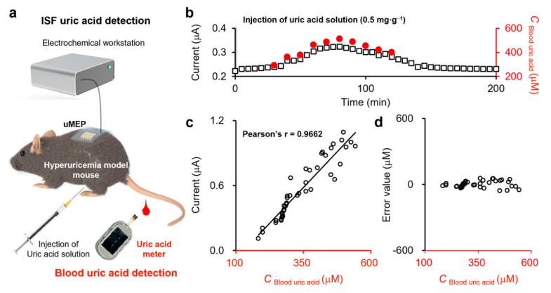 -1)后,uMEP記錄的ISF中UA電流反應(yīng)變化(黑色)和商用UA儀測量的血液中UA濃度(紅色)。(c)血流值與血UA濃度的相關(guān)性。(d)實(shí)測血UA濃度與預(yù)測血UA濃度(CUA)的誤差值。