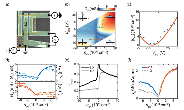 圖2. 二維超導(dǎo)觸頭的三探針測(cè)量。(a) 具有測(cè)量配置的設(shè)備的假彩色掃描電子顯微鏡圖像。NbN/Nb/Ti超導(dǎo)電極(綠色)和Au/Cr正常電極(黃色)與石墨烯(藍(lán)色)接觸。橙色虛線表示頂部柵極。(b) 在T=10.8 K的溫度下,正常狀態(tài)電導(dǎo)(GN)隨石墨烯(nch)溝道區(qū)電荷濃度和外加背柵電壓(VBG)的變化。對(duì)于(c),兩條垂直黃色虛線分別對(duì)應(yīng)于nch=−2×10