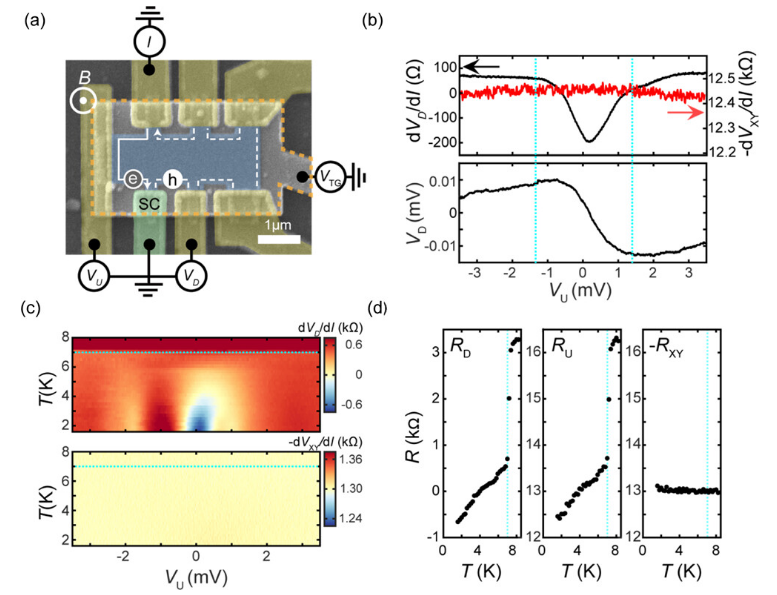 圖4. 負(fù)填充因子ν=−2的量子霍爾態(tài)中的交叉Andreev轉(zhuǎn)換。(a) 石墨烯霍爾棒器件的假彩色掃描電子顯微鏡圖像,該器件由具有測(cè)量結(jié)構(gòu)的二維(2D)超導(dǎo)鉬/錸(MoRe)觸點(diǎn)制成。更超導(dǎo)的電極(綠色)和Au/Cr正常電極(黃色)與石墨烯(藍(lán)色)接觸。橙色虛線表示頂部柵極。(b) 上面板:在磁場(chǎng)B=4.559 T、背柵極電壓V