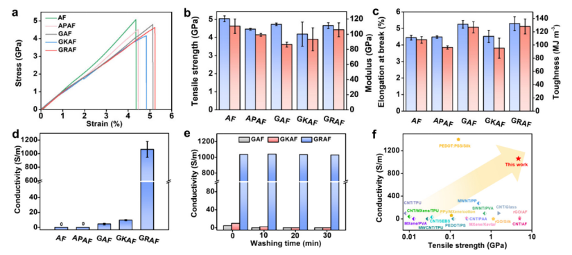 Fig 4. 設(shè)計的 GRAF 的機械和電氣性能。(a) 不同纖維的應力-應變曲線。(b) 不同纖維的拉伸強度和 Young 模量的比較。(c) 不同纖維的斷裂伸長率和韌性比較。(d) 不同纖維的電導率曲線。(e) 不同洗滌時間纖維的電導率比較。(f) 不同導電復合纖維和我們制備的纖維的導電性和拉伸強度的比較。