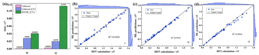 圖4. (a) 不同模型的均方誤差比較結(jié)果、確定系數(shù)以及(b)鋁基體、( c)石墨烯/鋁復合材料完美界面和(d)石墨烯/鋁復合材料缺陷界面的DFT比較機器學習預測結(jié)果。