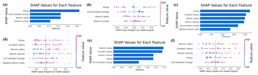 圖5. (a) 鋁基質(zhì) (c) 石墨烯/鋁復合材料完美界面和 (e) 石墨烯/鋁復合材料缺陷界面的 SHAP 值,(b) 鋁基質(zhì) (d) 石墨烯/鋁復合材料完美界面和 (f) 石墨烯/鋁復合材料缺陷界面的 SHAP 摘要圖表。