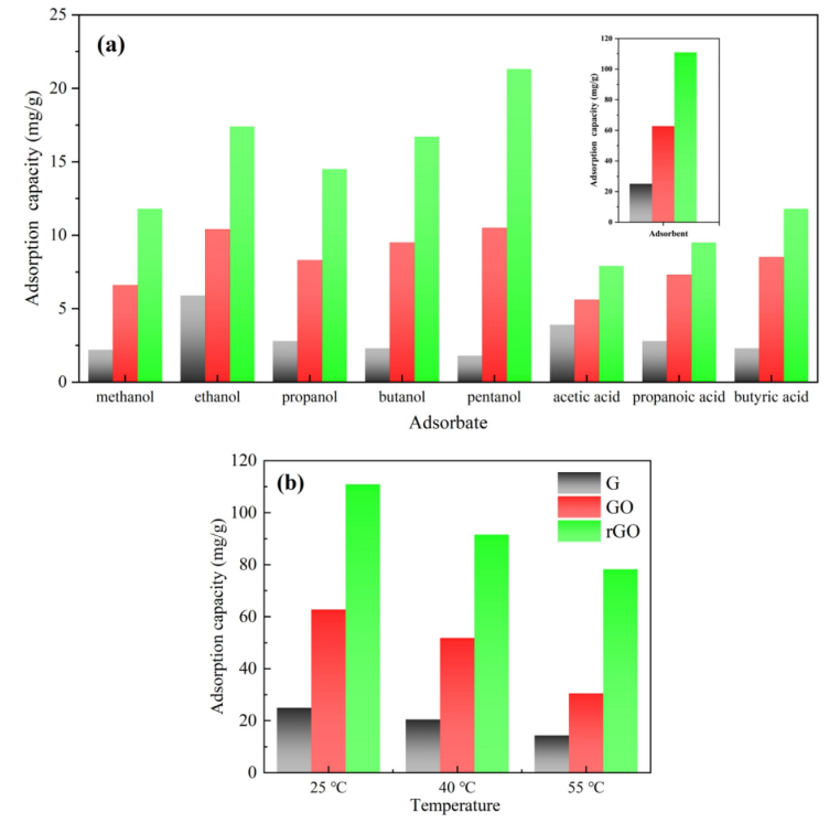 費托合成(FTS)廢水中的有機污染物低碳醇和酸是費托合成(FTS)工業(yè)化的限制因素。在這項工作中,研究了石墨烯上醇酸吸附和表面物質之間的結構容量關系,揭示了它們之間復雜的相互作用。以片狀石墨(G)為原料,采用改進Hummers法制備了氧化石墨烯(GO)和還原氧化石墨烯(rGO),并通過SEM、XRD、XPS、FT-IR和Raman表征了樣品的理化性質。通過理論和實驗方法測定了醇酸對G、GO和rGO的吸附行為和吸附量。結果表明,COOH、C=O和C-O在石墨烯上的存在占據(jù)了吸附位點,增加了水與石墨烯的相互作用,不利于醇酸的吸附。醇和酸的平衡吸附量隨碳數(shù)的增加而增加。通過模型擬合驗證了石墨烯上的單層吸附。由于氧的減少,還原氧化石墨烯具有最高的FTS模擬廢水吸附量(110 mg/g),。這些新發(fā)現(xiàn)為醇酸廢水的處理,以及高性能碳基吸附材料的設計和開發(fā)提供了基礎。