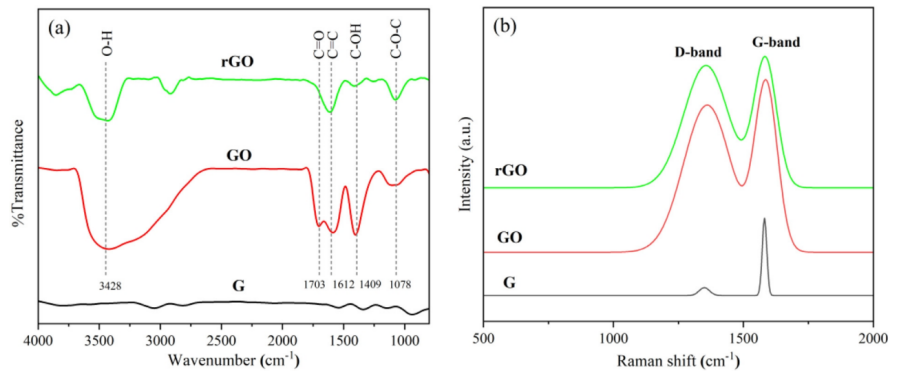 圖4. (a)FT-IR光譜;拉曼光譜。