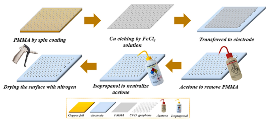 流程圖1. 使用簡易濕法轉(zhuǎn)移工藝將BLG從銅箔轉(zhuǎn)移到FTO基板的示意圖。