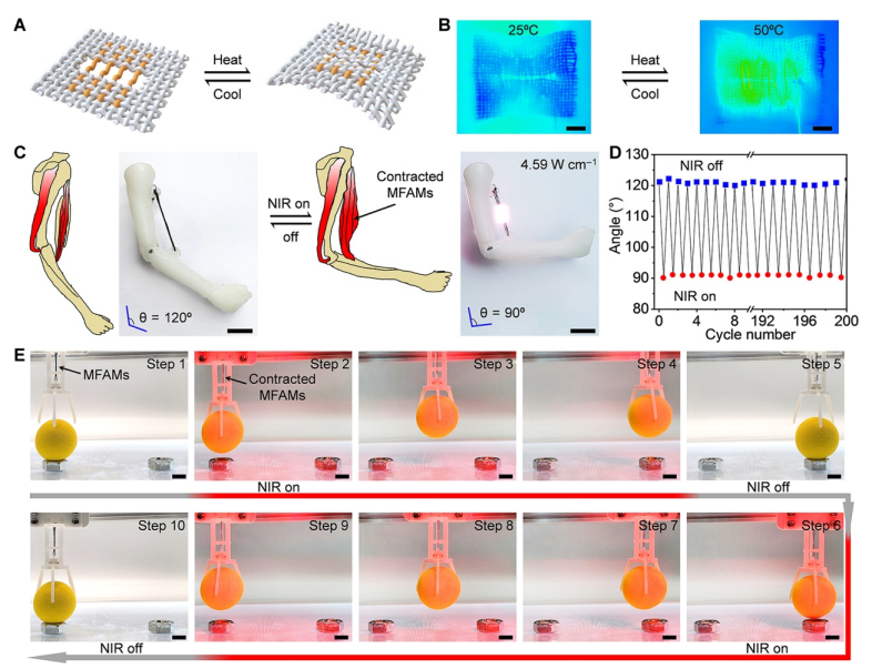 圖 4. MFAM 收縮驅(qū)動演示。(A) 用 MFAM 編織的紡織品示意圖,用于提供熱生可編程形狀變形。(B) 紡織品在 25° 和 50°C 下熱驅(qū)動的紅外熱圖像。(C) 由四個平行 MFAM 驅(qū)動的舉重假肢的示意圖和光學照片,這些假肢由 NIR 激光加熱。當 MFAM 暴露在 808 nm NIR 激光下時,它們會像手臂的二頭肌一樣收縮。(D) 顯示在 200 次重復的 NIR 激光驅(qū)動循環(huán)中肘部彎曲的角度的圖。(E) 八個平行 MFAM 組合在一起并應用于機器人夾持器,用于抓取、轉(zhuǎn)移、傳送和回收玩具球。比例尺,1 厘米 (B)、5 毫米 (C) 和 5 毫米 (E)。