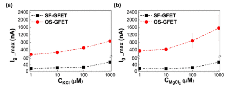 圖4. SF-GFET和OS-GFET在1、10和100μM電解液中石墨烯輸運(yùn)行為的比較。(a) SF-GFET和OS-GFET在KCl水溶液中的最大柵電流。(b) SF-GFET和OS-GFET在MgCl