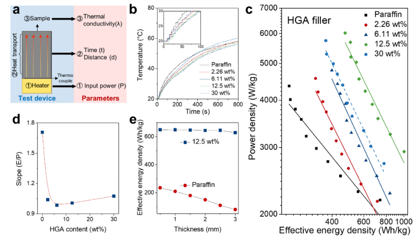 Fig 4. PGC 的有效能量密度和功率密度。(a) PCM 的有效能量密度和功率密度的原型設(shè)備及其相關(guān)參數(shù)。(b) 在輸入功率為 0.34 W 時(shí),石蠟和 PGC 的溫度升高曲線。(c) 石蠟和 PGC 的有效能量密度與功率密度的關(guān)系。30 wt%處有效能量密度和功率密度的下降用虛線標(biāo)記。(d) PGC 的斜率(E/P)與 HGA 含量的關(guān)系。(e) 石蠟和含有 12.5 wt% HGA 填料的 PGC 的有效能量密度隨厚度的變化。