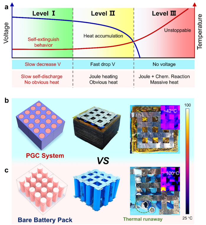 Fig 1. LIB 電池的 PGC 熱管理系統(tǒng)。(a) LIB 電池?zé)崾Э氐娜齻€(gè)階段。(b) 帶有 PGC 冷卻系統(tǒng)的電池組的示意圖及其在 30 A 充放電循環(huán)期間的數(shù)字照片和熱成像。(c) 裸電池組的示意圖及其在 30 A 充放電循環(huán)期間的數(shù)字照片和熱成像。