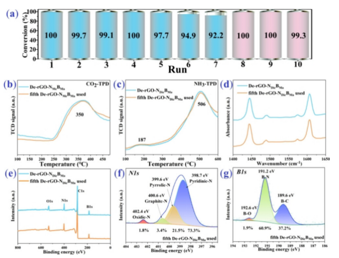 3-TPD(c)、Py-FTIR(d)、全掃描XPS譜(e)、XPS-N 1s(f)和XPS-B 1s(g)對De-rGO-N