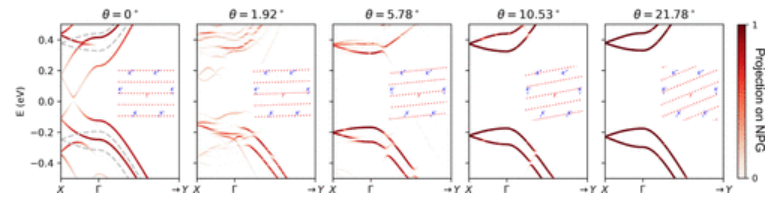 圖2. NPG/石墨烯在不同 θ 處的帶結(jié)構(gòu),投影在 NPG 上并展開到其布里淵區(qū)。展開的條帶在沿 (X → Γ) 和沿 (Γ → Y) NPG 帶軸的方向上表示。單層 NPG 的能帶結(jié)構(gòu)在對應(yīng)于 θ = 0°(灰色虛線)的面板中繪制為參考。插圖顯示了石墨烯的 K/K′ 點(diǎn)(藍(lán)色)和 NPG 的延伸 Γ 點(diǎn)在折疊前在廣義動(dòng)量空間中旋轉(zhuǎn)了相應(yīng)的角度(紅色)。