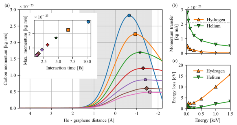 高速原子與石墨烯的耦合 (a) 不同動能氦原子與碳原子相互作用過程中的動量變化:30 eV(圓形)、60 eV(方形)、120 eV(星形)、250 eV(加號)、500 eV(五邊形)、1000 eV(菱形)及1500 eV(叉形)?;疑珔^(qū)域表示±1.7 Å范圍內的范德華相互作用區(qū)。插圖為對應動能下入射粒子通過相互作用區(qū)的持續(xù)時間。(b) 氦(He)與氫(H)穿透材料時,碳原子所受橫向動量轉移隨入射粒子動能的變化。虛線表示石墨烯中碳原子面內動量不確定度。(c) 氦與氫穿透材料時,電子系統(tǒng)的能量損失隨入射粒子動能的變化。圖(b-c)中符號為理論計算結果,線條僅作視覺引導。