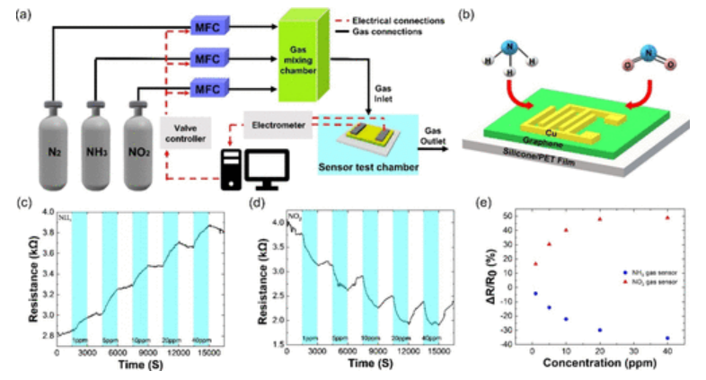 FiFig 4. 使用具有圖案化后銅接觸的石墨烯器件進(jìn)行氣體傳感。(a) 氣體測試裝置示意圖。(b) 氣體分子(氨氣(NH?)和二氧化氮(NO?))與石墨烯器件之間相互作用的示意圖。(c) 電阻與氨氣濃度的關(guān)系。(d) 電阻與二氧化氮濃度的關(guān)系。(e) 歸一化電阻與氣體濃度的關(guān)系。