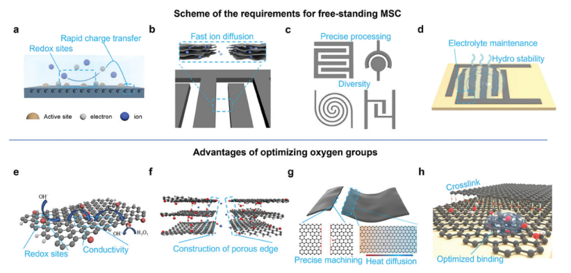 Fig 1. a - d)自支撐微型超級(jí)電容器(MSC)的示意圖:a)高氧化還原位點(diǎn)與快速電荷轉(zhuǎn)移。b)邊緣處的快速離子擴(kuò)散。c)多樣性與精確加工。d)電解質(zhì)保持與耐水穩(wěn)定性。e - h)優(yōu)化氧基團(tuán)的優(yōu)勢(shì):e)平衡活性位點(diǎn)與電導(dǎo)率。f)形成多孔結(jié)構(gòu)。g)低能量刻寫與高效散熱。h)將電解質(zhì)與石墨烯片結(jié)合。