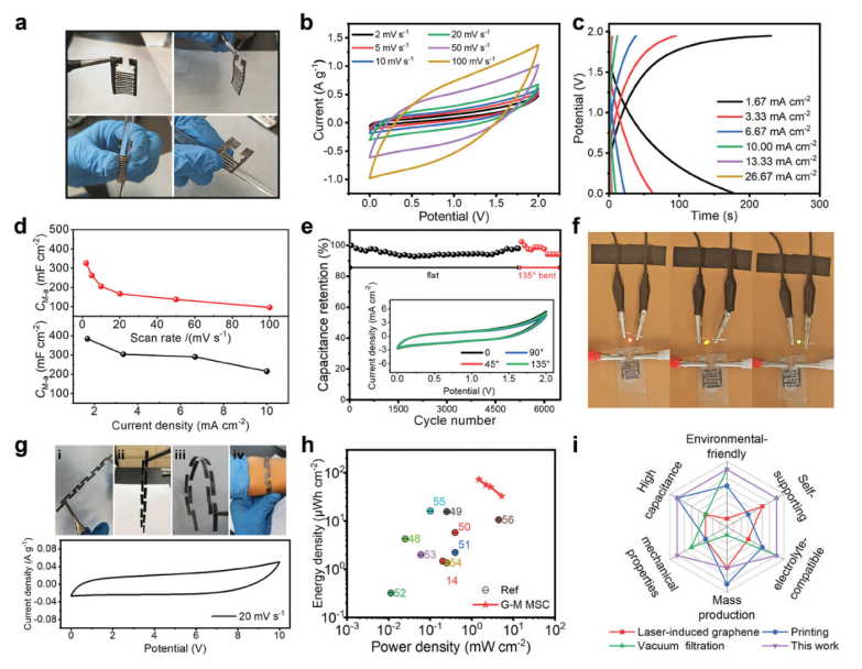 Fig 6. a) 無基底的柔性自支撐微型超級(jí)電容器(MSC)的圖片。b、c) 中等氧化石墨烯(G - M)微型超級(jí)電容器(MSC)在不同掃描速率和電流密度下的循環(huán)伏安(CV)曲線和恒電流充放電(GCD)曲線。d) 不同電流密度和掃描速率下的面電容。e) 平面和彎曲狀態(tài)下的循環(huán)穩(wěn)定性(插圖為掃描速率為 10 毫伏 / 秒時(shí)不同彎曲角度下的循環(huán)伏安曲線)。f) 由自支撐微型超級(jí)電容器(MSC)點(diǎn)亮的發(fā)光二極管(LED)的照片。g) 10 個(gè)串聯(lián)的微型超級(jí)電容器(MSC)在平坦和彎曲狀態(tài)下的圖片及其在 20 毫伏 / 秒時(shí)的循環(huán)伏安曲線。h) 中等氧化石墨烯(G - M)微型超級(jí)電容器(MSC)與已報(bào)道結(jié)果的能量和功率密度對(duì)比。i) 與其他微型超級(jí)電容器(MSC)器件相比,這項(xiàng)工作的優(yōu)勢(shì)。
