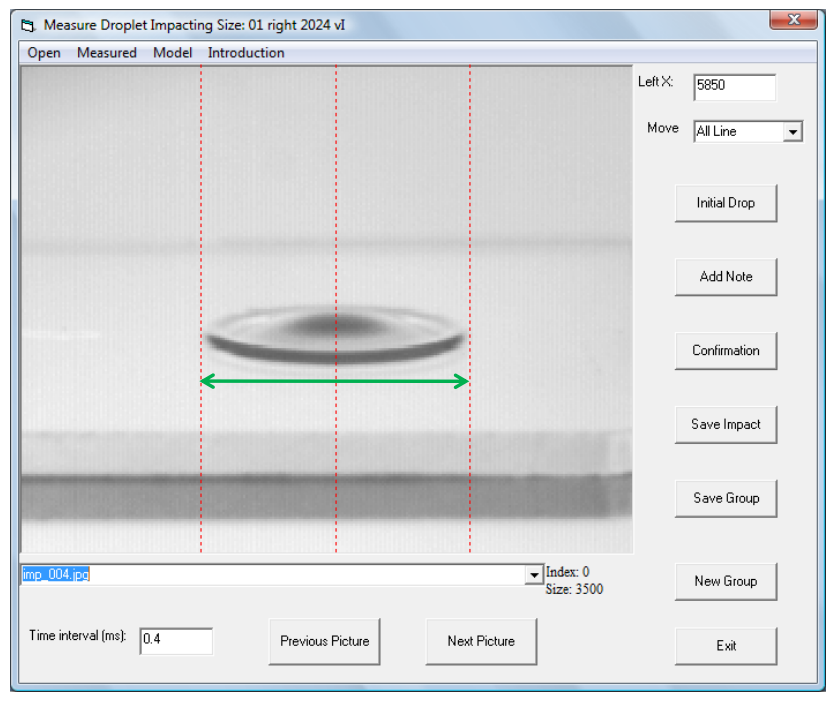 圖2.4. 用于測量液滴在樣品表面瞬時鋪展直徑(綠色箭頭)的Visual Basic軟件界面。
