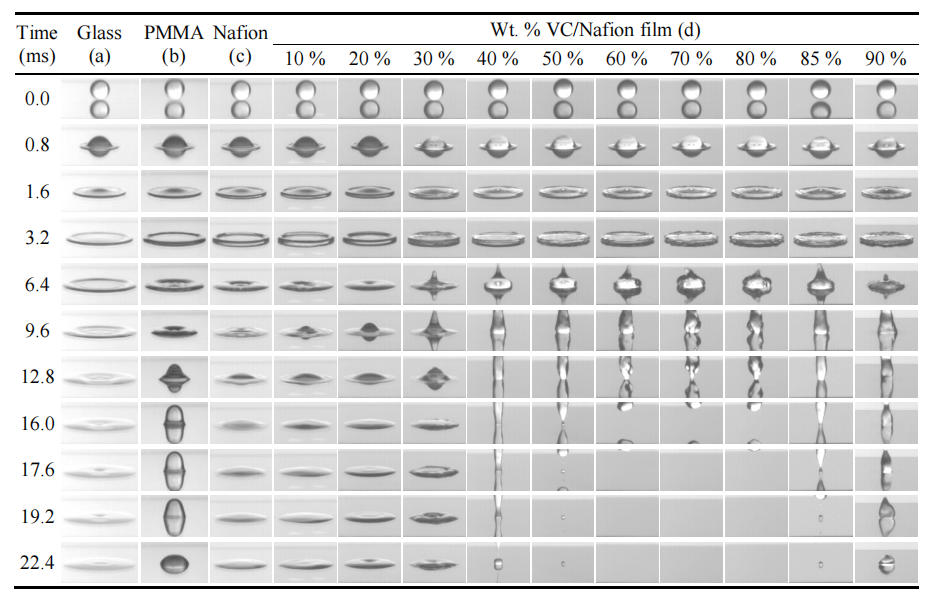 圖3.1. 直徑2.4 mm水滴撞擊不同基底材料的動態(tài)序列圖像:(a) 裸玻璃;(b) 聚甲基丙烯酸甲酯(PMMA);(c) 全氟磺酸樹脂(Nafion);(d) 玻璃基體表面涂覆的10–90 wt.% 火山碳(VC)/Nafion復合薄膜(沖擊高度均為120 mm)。液滴行為的差異源于材料表面能特性差異。