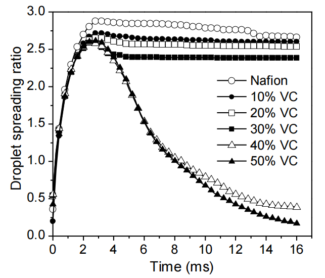 圖3.4. 水滴撞擊旋涂全氟磺酸樹脂(Nafion)薄膜及系列火山碳(VC)/Nafion復合基底表面(10–50 質量分數(shù))的實驗鋪展率。