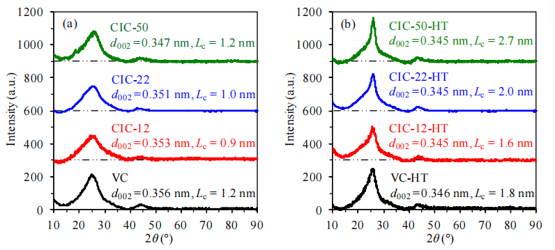 圖4.1. 碳材料樣品熱處理前后的X射線衍射(XRD)圖譜。(a) 未熱處理樣品、(b) 氮氣氣氛中1500°C熱處理(HT)后樣品。曲線下方的點劃虛線表示各圖譜的基線。通過對應圖譜中2θ≈25°處的衍射峰,應用布拉格定律計算層間距(d<sub>002</sub>),并基于謝樂方程獲得c軸方向晶粒尺寸(L<sub>c</sub>)[164]。