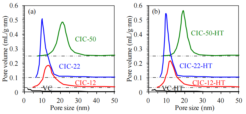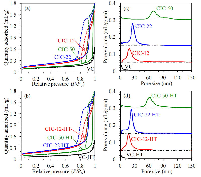 (a)吸附支、(b)脫附支數(shù)據(jù)通過Barrett-Joyner-Halenda (BJH) 方法計算,并以炭黑t-曲線為標準確定氮氣吸附膜的統(tǒng)計厚度。