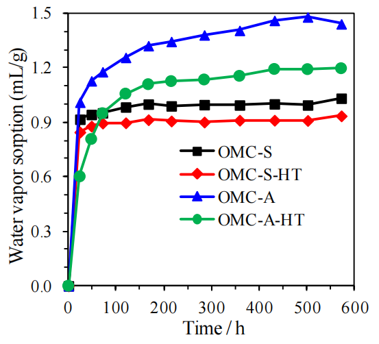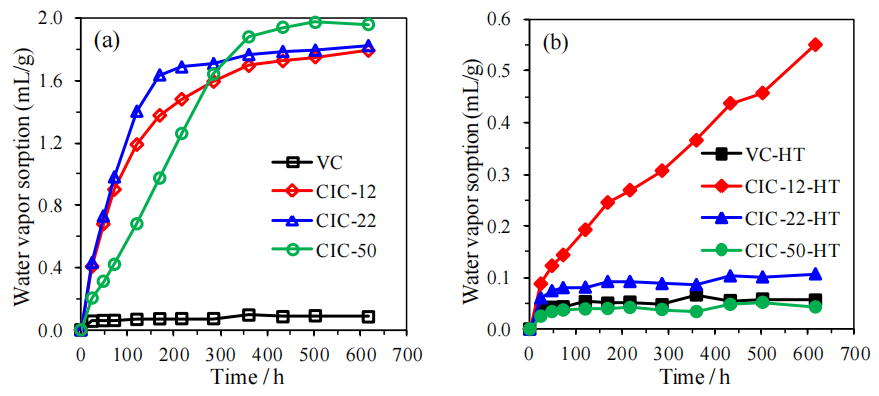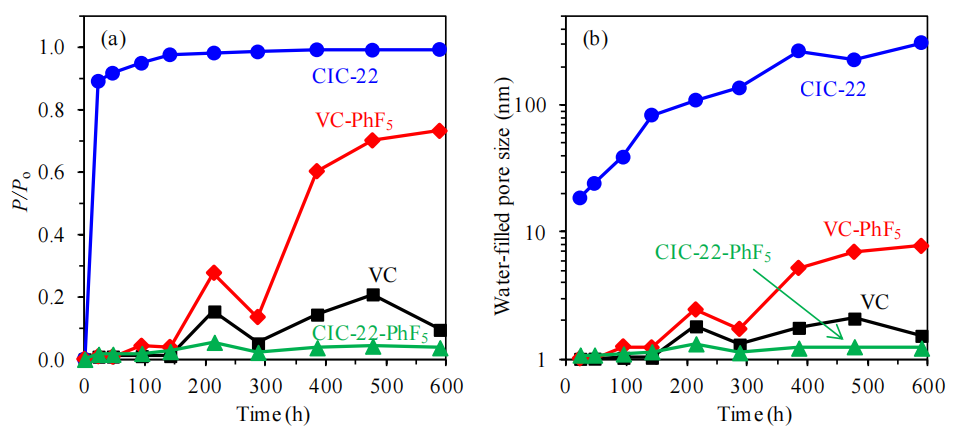 原始碳材料(如CIC-22)因表面含氧官能團(羥基、羧基等)的親水性,可能通過氫鍵作用加速水蒸氣吸附;而功能化后,化學惰性-PhF5基團阻礙了水分子與表面的直接接觸,吸附速率降低;