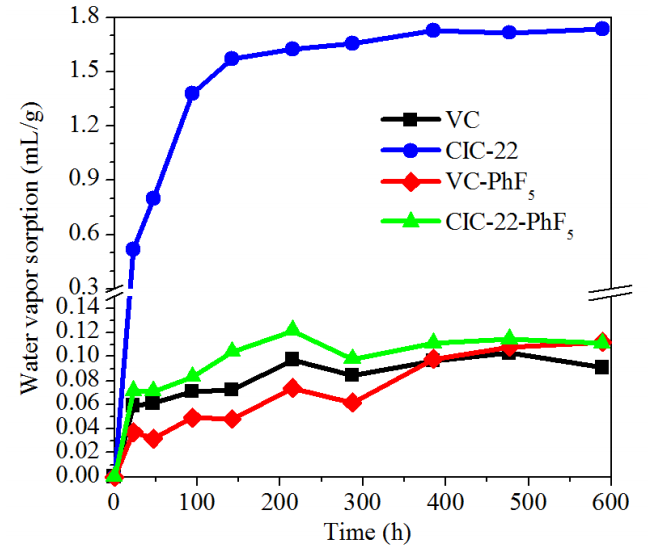 圖6.5. 五氟苯基(-PhF5)基團表面功能化前后VC與CIC-22材料在室溫水蒸氣環(huán)境中的水蒸氣吸附(WVS)數(shù)據(jù)