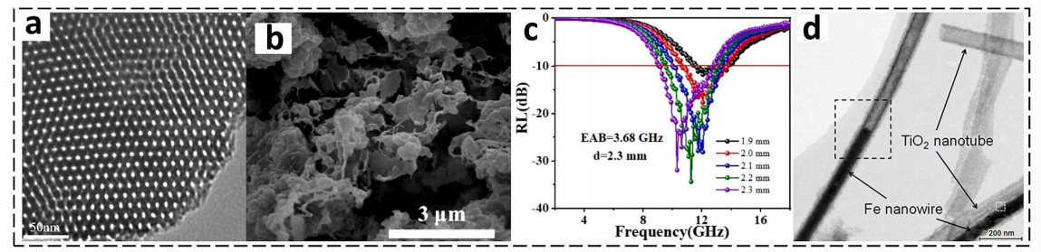| d | Fe/TiO?核殼納米線 | Fe核(直徑80 nm)+TiO?殼(5 nm) | 磁-介電協(xié)同:Fe提供磁損耗,TiO?殼抑制渦流 |