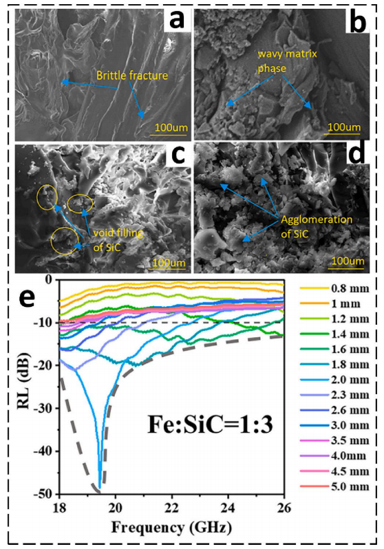 | e | Fe/SiC復(fù)合材料 | Fe納米顆粒(100–150 nm)嵌入SiC基體 | 磁-介電協(xié)同:Fe磁損耗 + SiC介電共振 |