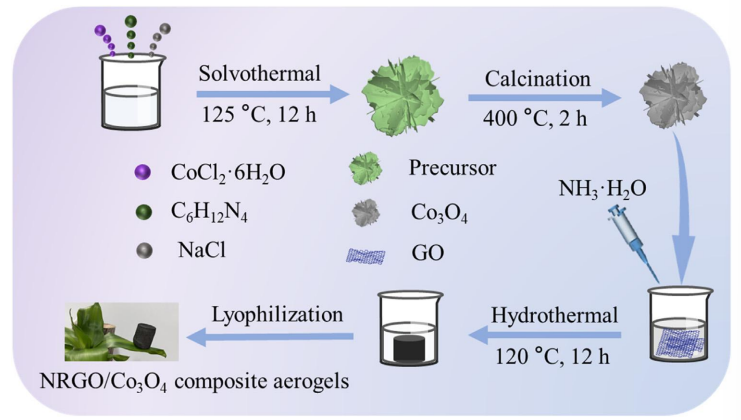 · 該示意圖詳細描繪了氮摻雜還原氧化石墨烯/三氧化二鈷(NRGO/Co3O4)復合氣凝膠的制備過程,整個過程分為三個主要步驟。