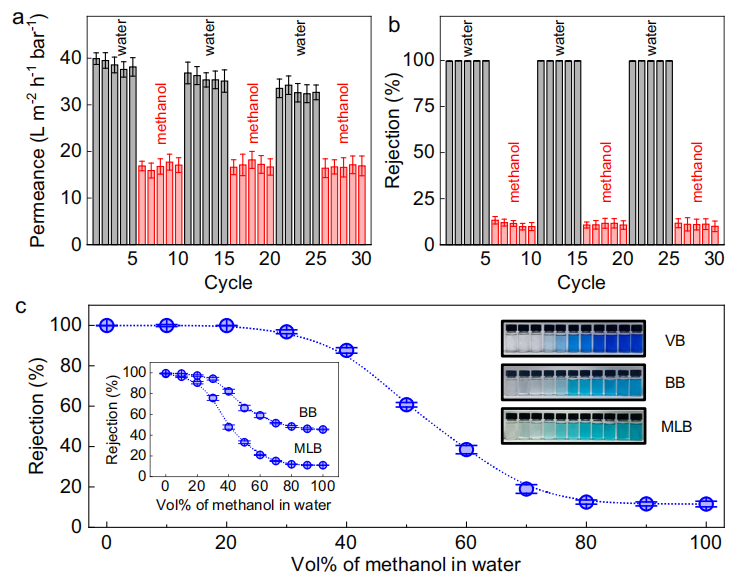 · 在水中,膜表現(xiàn)出與純GO膜相當(dāng)?shù)姆肿恿拷亓糁担∕WCO=319 g·mol?¹),滲透率達(dá)45.52 L·m?²·h?¹·bar?¹;在甲醇中MWCO可逆切換至960 g·mol?¹,滲透率為13.56 L·m?²·h?¹·bar?¹。通過水/甲醇交替,VB染料截留率可逆切換(100%↔15%),實(shí)現(xiàn)動(dòng)態(tài)篩分調(diào)控。
