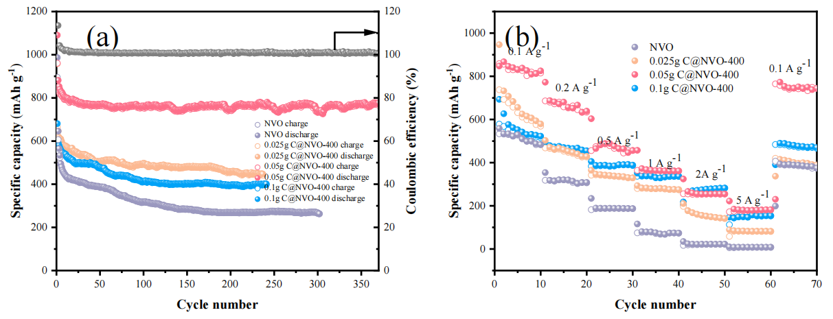 Figure S8. (a)NVO、0.025gC@NVO、0.05gC@NVO和0.1gC@NVO電極的循環(huán)性能;(b)NVO、0.025gC@NVO、0.05gC@NVO和0.1gC@NVO電極的倍率性能。