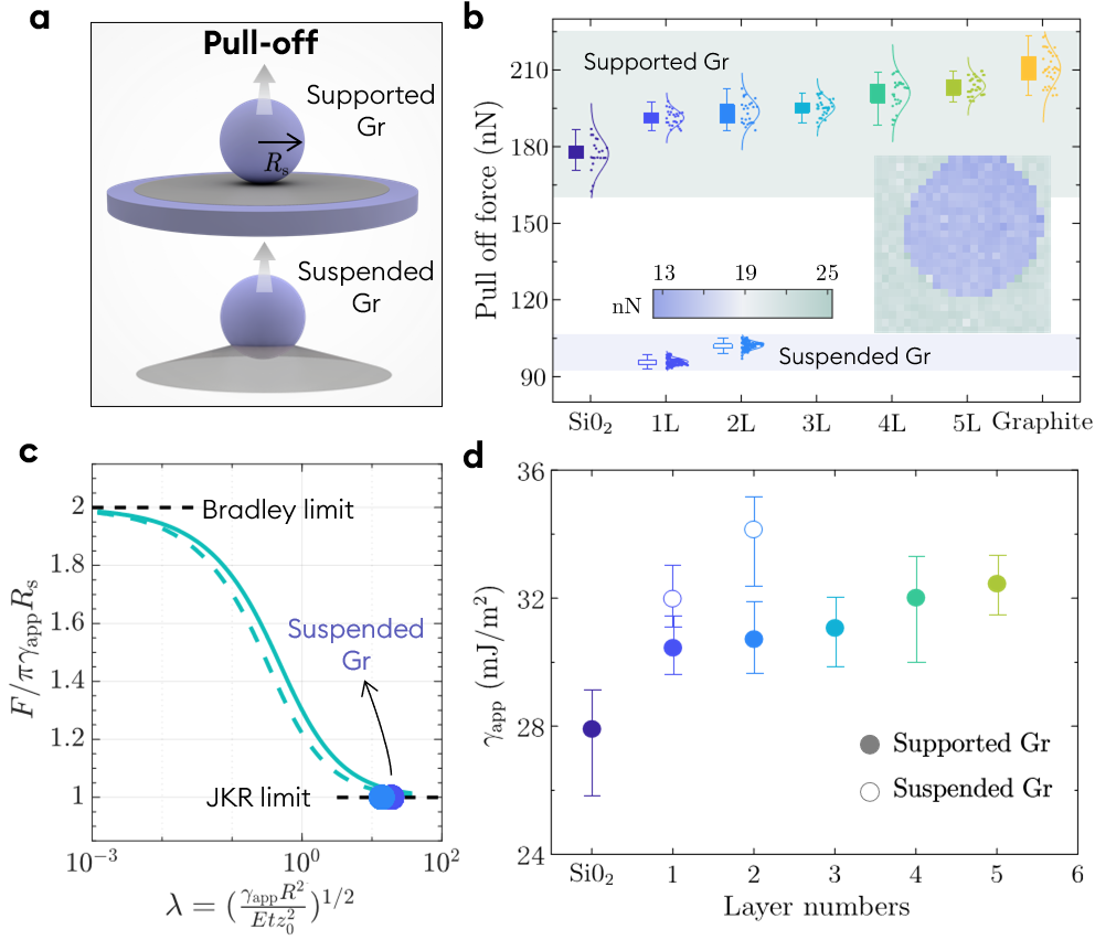 石墨烯-硅襯底體系中的薄膜厚度可以精確控制至原子尺度,為解決這一爭(zhēng)議問題提供了理想實(shí)驗(yàn)平臺(tái)。然而,在單原子層厚度下,薄膜極易發(fā)生幾何非線性變形,對(duì)實(shí)驗(yàn)測(cè)量和數(shù)據(jù)解析帶來巨大挑戰(zhàn)。針對(duì)這一難題,團(tuán)隊(duì)提出了“原子力顯微鏡表征+非線性薄膜力學(xué)分析”相結(jié)合的研究方案。研究人員首先通過配備膠體探針的原子力顯微鏡(圖1),測(cè)量了石墨烯在懸浮與支撐狀態(tài)下的拉脫力(pull-off force)。結(jié)果表明,拉脫力可通過接觸力學(xué)模型轉(zhuǎn)化為界面能,其轉(zhuǎn)換系數(shù)隨薄膜可變形能力增強(qiáng)而漸近收斂至剛性結(jié)構(gòu)的一半(圖2)。這一修正對(duì)于解釋薄膜材料自發(fā)撕裂等界面現(xiàn)象至關(guān)重要。
